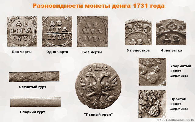 Еще одна любопытная разновидность – так называемая денга 1731 года с «пьяным орлом». Отличается своеобразной фигурой орла на аверсе (смотри схему выше).